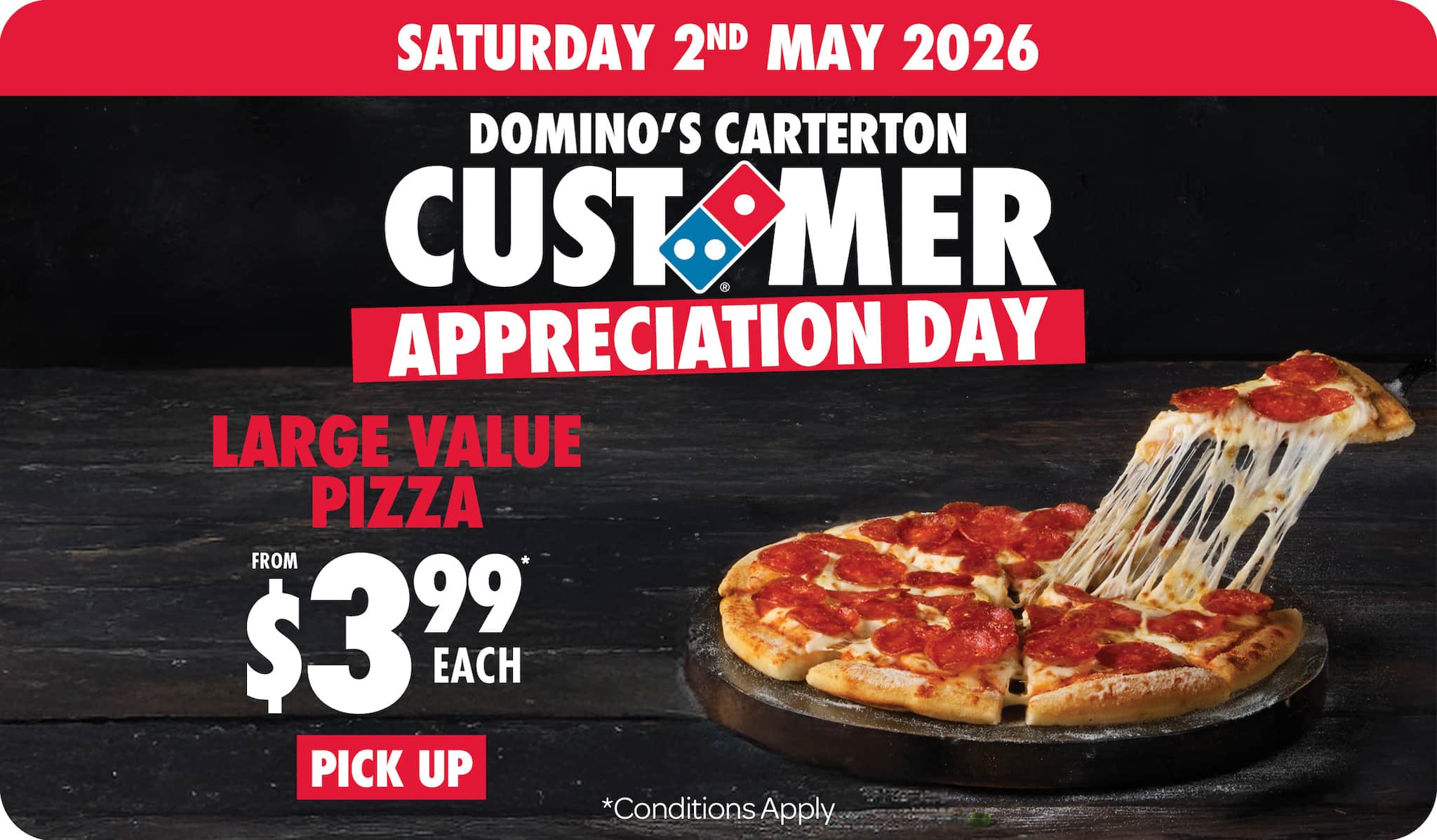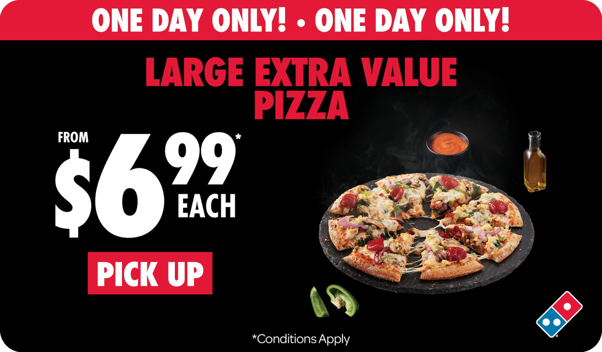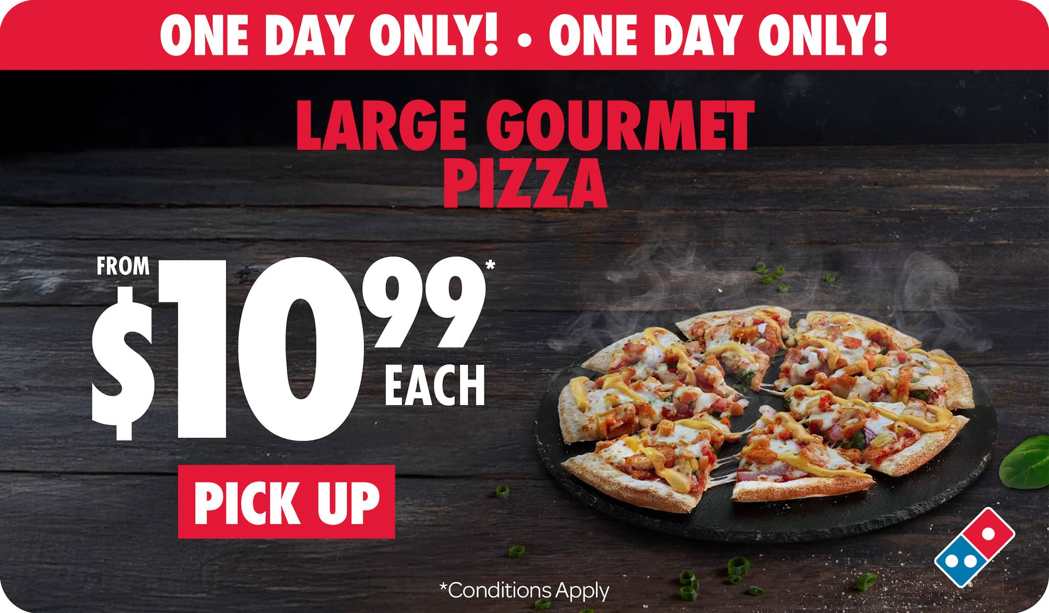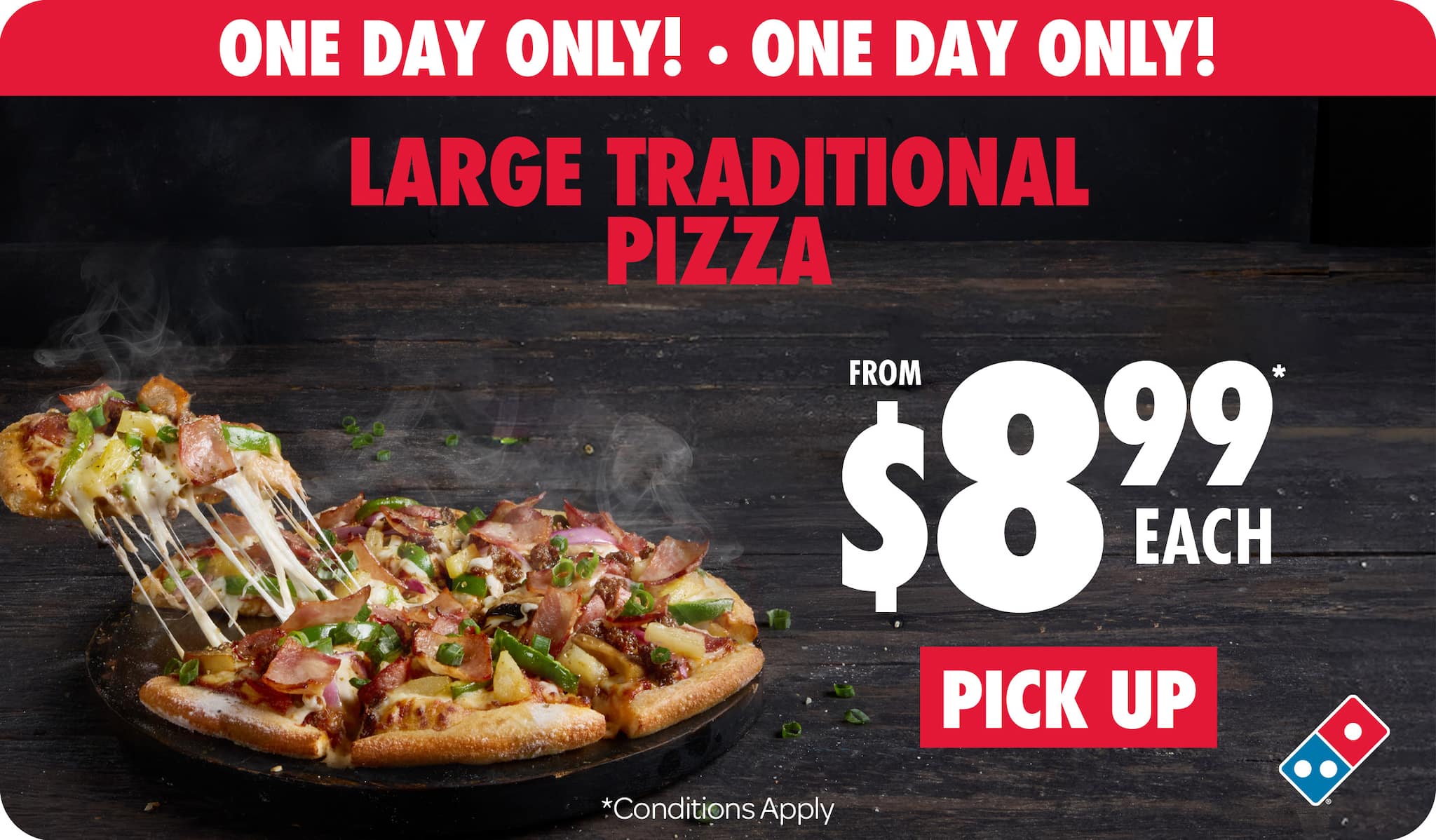 *Valid for pick up only. Not available with any other coupon, offer or promotional priced items. Customisation may incur further charges as displayed in order basket. Excludes Half ’n’ Half Pizzas.