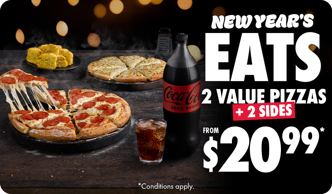 *Conditions apply. Pepperoni and Simply Cheese Cheesy Crust Large Pizzas from $10.49. Valid for a limited time only. Customisation may incur additional charges. Offer available online at participating stores. Minimum delivery order $22.