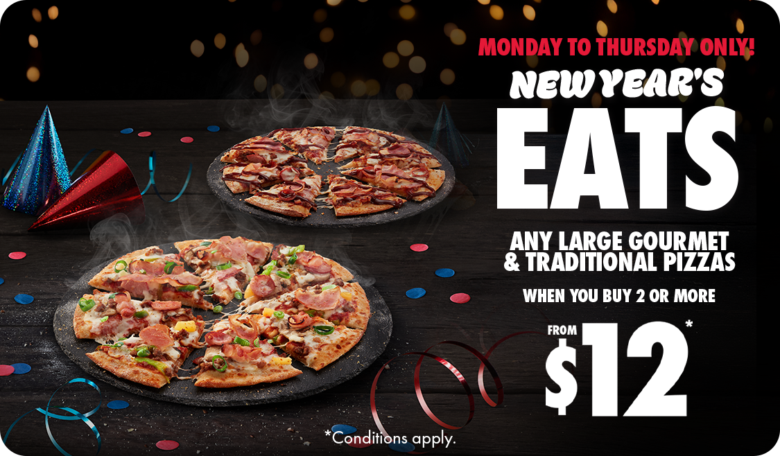 *Conditions apply. Valid for a limited time at selected stores only. Get any Large Traditional or Gourmet Pizza from $12 each when you buy 2 or more. Exludes Cheesy Crust pizza range and Half 'n' Half. Customisation and upgrades may incur additional charges. Minimum delivery order $22.