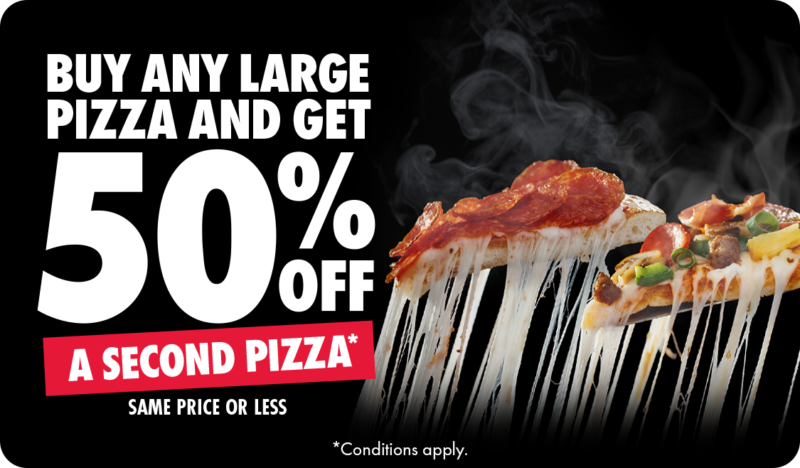 *Conditions apply. Offer available online for delivery only at participating stores. Excludes Half 'n' Half pizzas. Customisation and upgrades may incur additional charges. Minimum Delivery order up to $22.