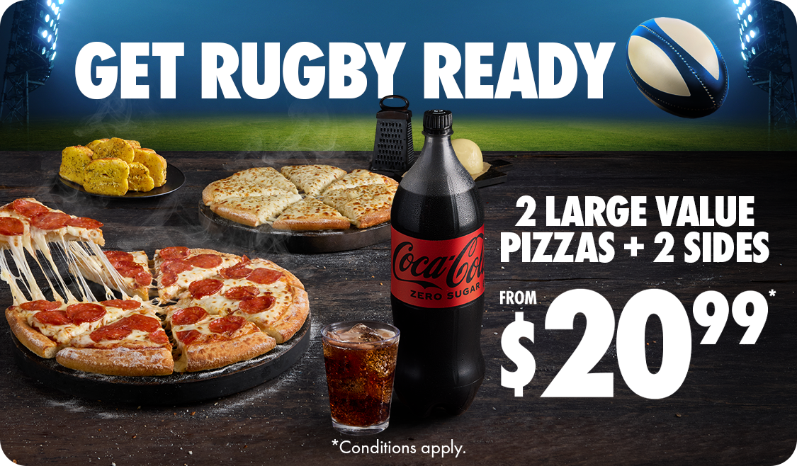 *Offer available online only. Base price includes Large Value Range pizzas, Garlic Bread and 1.5L drink. The deal can be upgraded for additional costs. Minimum delivery order $22. Selected stores only.