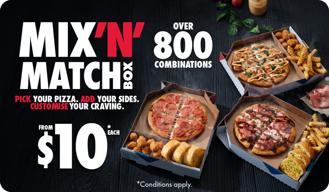 *Conditions apply. Limited time only at selected stores. Base price includes Mini Value Pizza, Mini Garlic Bread & Crispy Chips. Customisation may incur additional charges. Minimum delivery order $22.