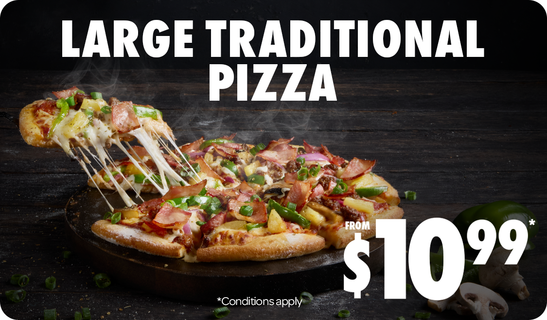 *Offer available online only. Base price includes Large Value Range Pizzas, Garlic Bread and 1.5L drink. The deal can be upgraded for additional costs. Minimum delivery order $22. Valid until 31/10/2025 at participating stores only.