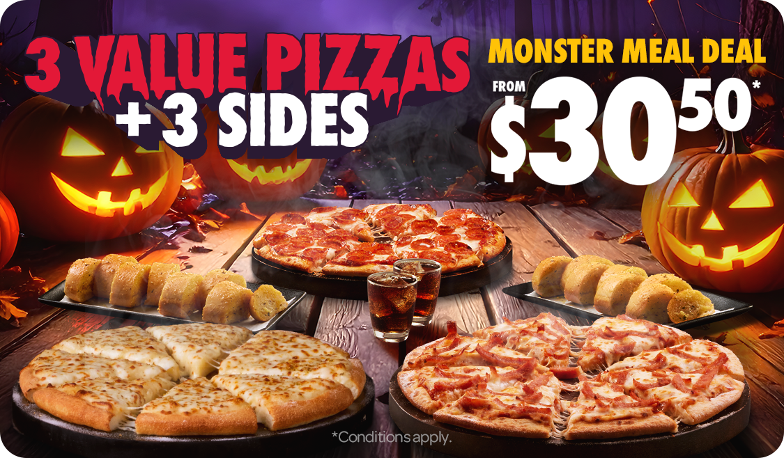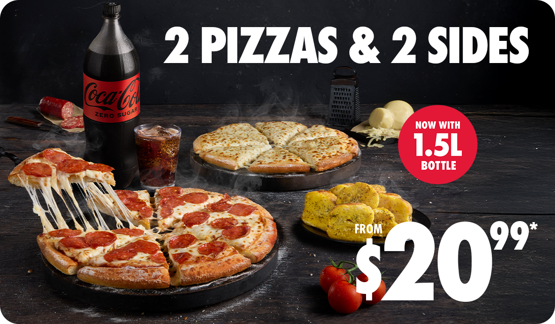 *Offer available online only. Base price includes Large Value Range Pizzas, Garlic Bread and 1.5L drink. The deal can be upgraded for additional costs. Minimum delivery order $22. Selected stores only. Valid until 31/10/2025.